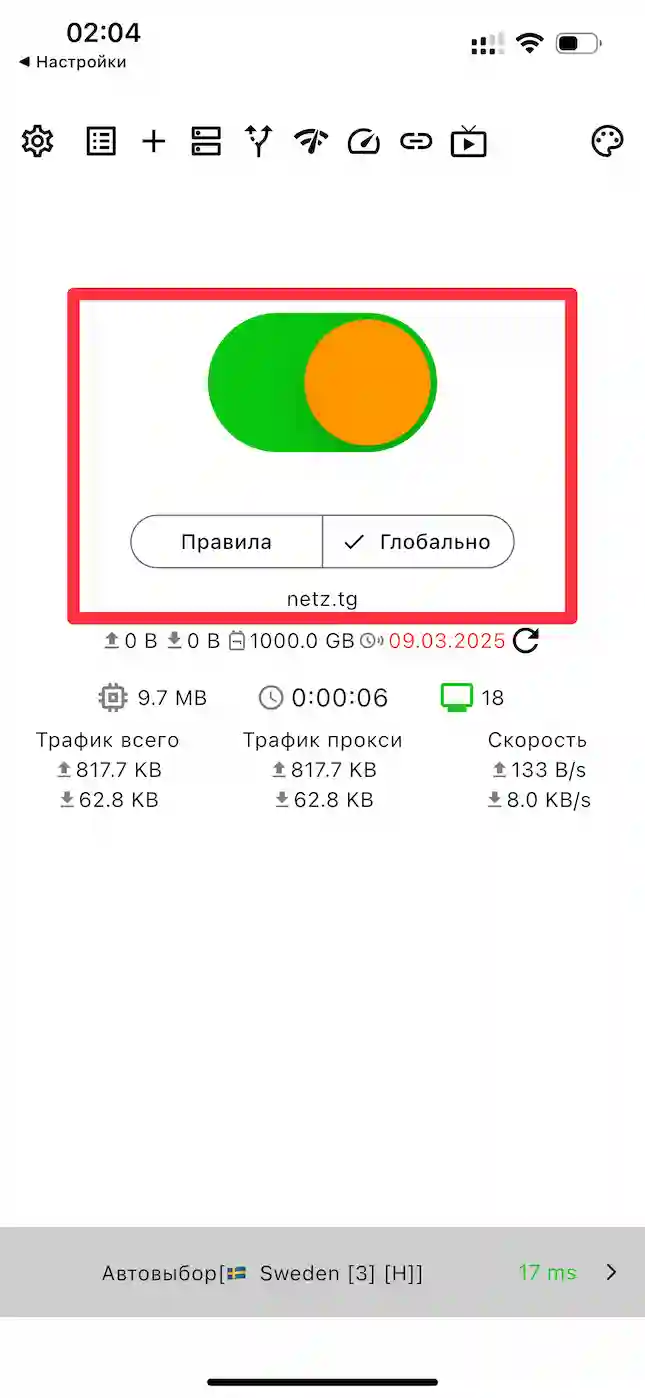 - На главном экране Karing нажмите на иконку ⚙️ слева вверху.