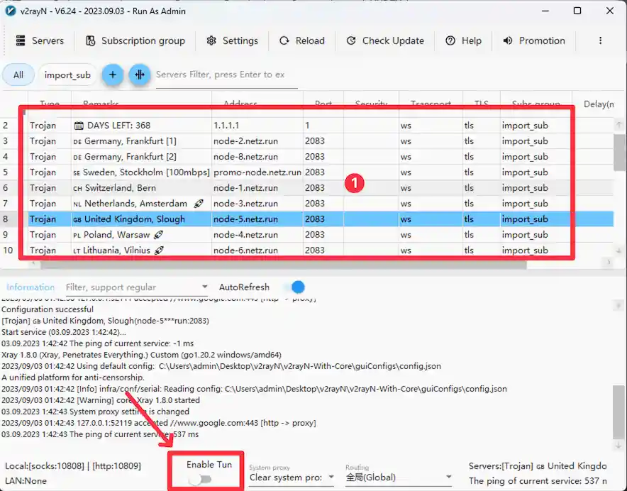 Чтобы выключить VPN, включите ползунок Enable TUN внизу программы